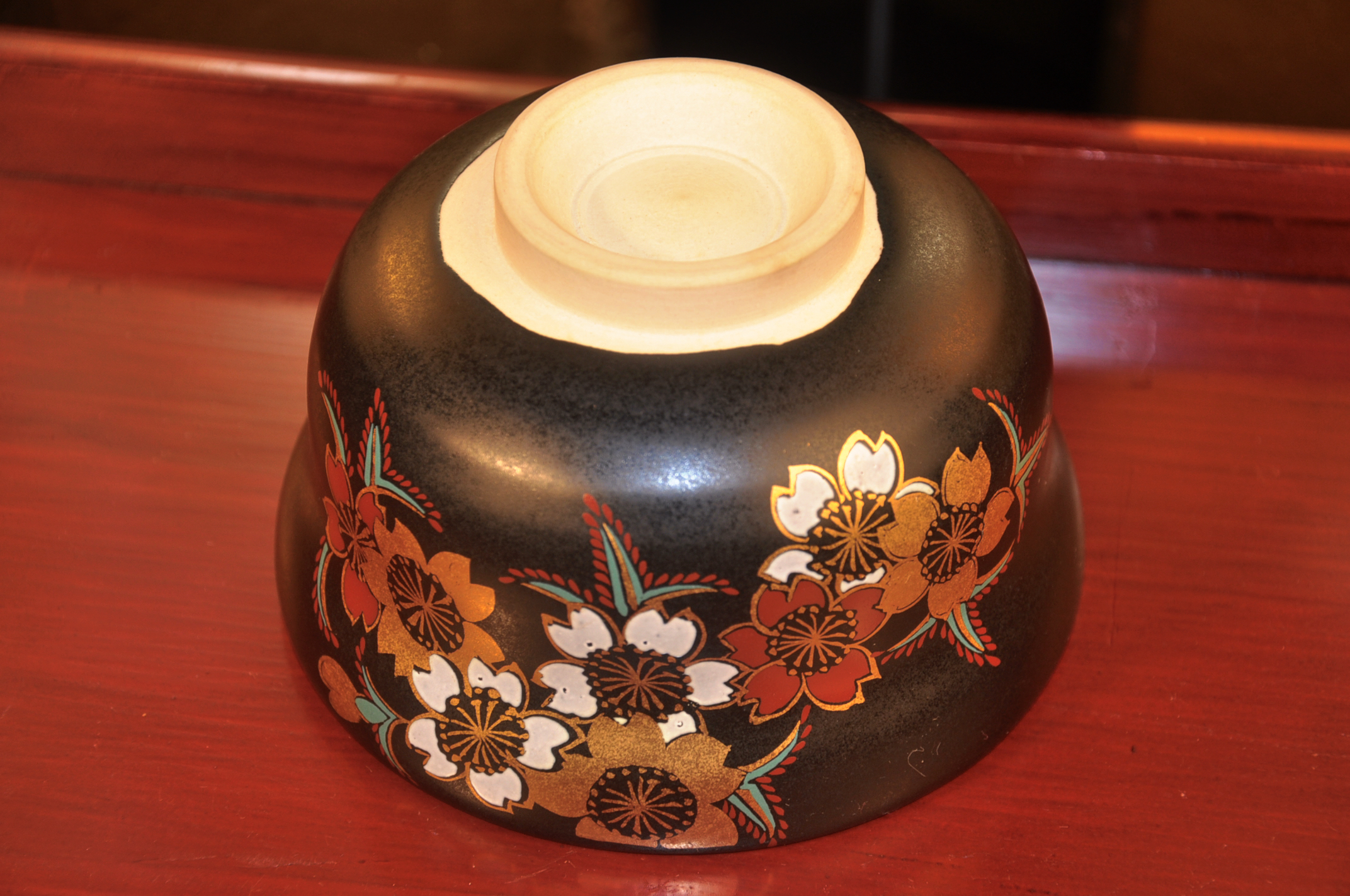 The bowl is finished in a deep tenmoku black glaze, fired at high temperature to achieve a soft, light-absorbing surface ideal for the tea ceremony. Over this calm black ground, a plum blossom motif is delicately hand-painted in 24K gold. In Japanese tea culture, plum blossoms symbolize renewal, resilience, and good fortune, making the design especially meaningful.